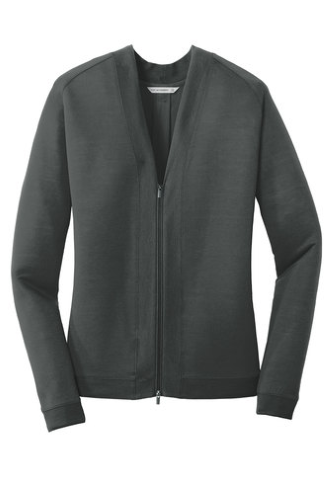 We took the classic bomber jacket style and reimagined it as a mixed fabric cardigan. 4.4-ounce, 62/33/5 poly/rayon/spandex jersey knit (front and sleeves). 3.3-ounce, 69/31 rayon/poly woven (back). Rib knit placket with two-way zipper.