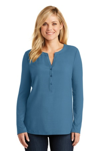 This soft, flowy tunic has professional edge with its woven front and knit back. 4.4-ounce, 62/33/5 poly/rayon/spandex jersey knit (sleeves and back) 3.3-ounce, 69/31 rayon/poly woven (front, back yoke and sleeve tabs). 3-button henley placket with dyed-to-match buttons.