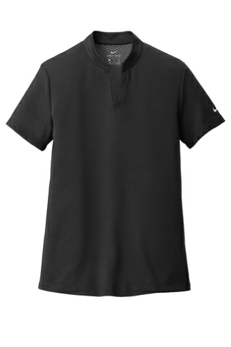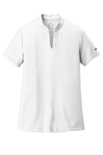 A contrast hex textured interior gives these styles a subtle exterior texture while Dri-FIT moisture management technology helps keep things from heating up. Design details include a self-fabric collar and open hem sleeves. Tailored for a feminine fit with a flattering v-neckline. The contrast heat transfer Swoosh design trademark is on the left sleeve. Made of 5-ounce, 100% polyester Dri-FIT fabric.