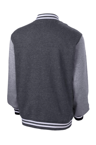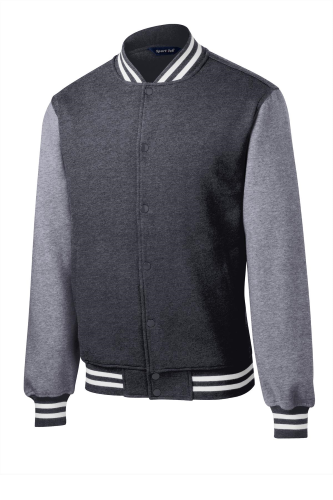 We took the traditional letterman jacket and reworked it in warm, comfortable fleece for a winning look.|9-ounce, 65/35 ring spun combed cotton/poly, 2x2 rib knit collar, cuffs and waistband, Snap front closure, Front slash pockets