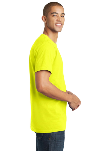 4.3-ounce, 100% soft spun cotton (colors), 50/50 soft spun cotton/poly (neon colors), 90/10 soft spun cotton/poly (Heather Grey), 30 singles, Tear-away tag.